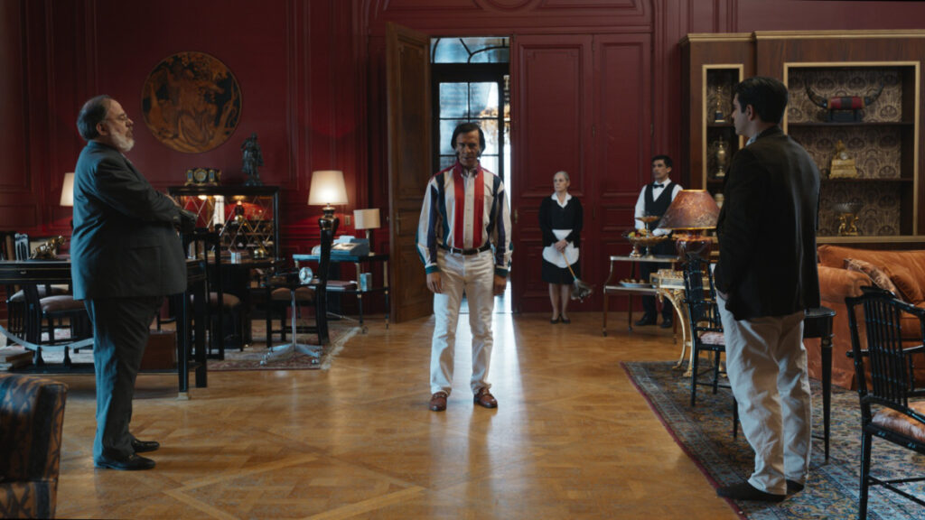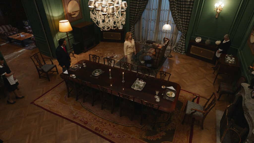 Natalia tomó algunas referencias de las reformas que se hicieron en la quinta en la época de Menem, y de ahí partió, como por ejemplo el ambiente pintado de rojo/bordo. Este ambiente en la serie fue el más grande que usamos, que además de las paredes oscuras, no tiene araña como fuente de luz principal. Por lo cual fue bastante difícil de iluminar, usamos los grandes ventanales por donde entrábamos con HMI y Ski Panel como luz principal, además en varias situaciones tuvimos que recurrir a «el distraído», lo cual consistía en una fuente de luz más puntual que rebotando al techo o algún telgo con cierta dirección logramos por un lado levantar el nivel y por otro contrarrestar la invasión cálida. En estos momentos acotamos un poco el 360º.