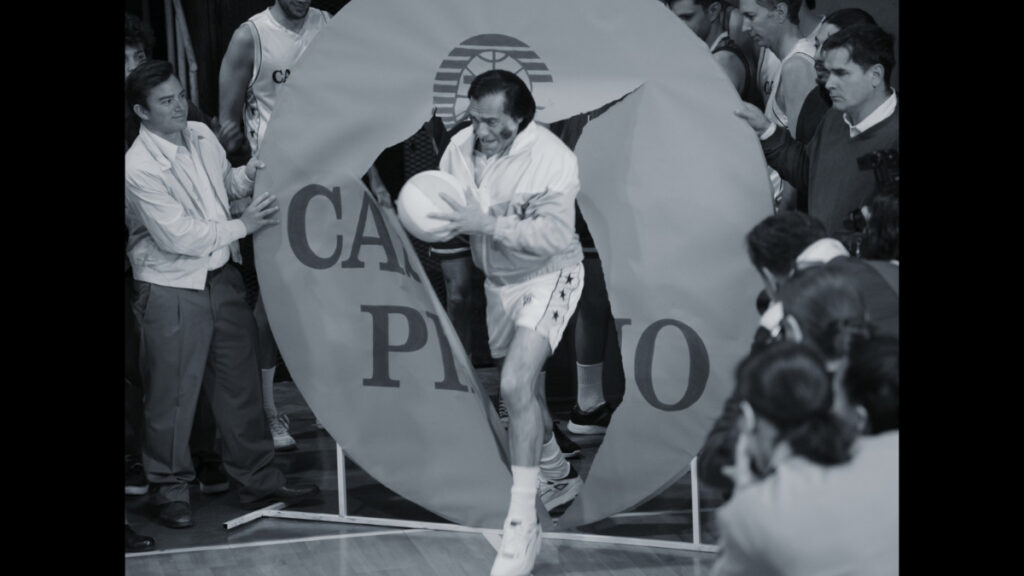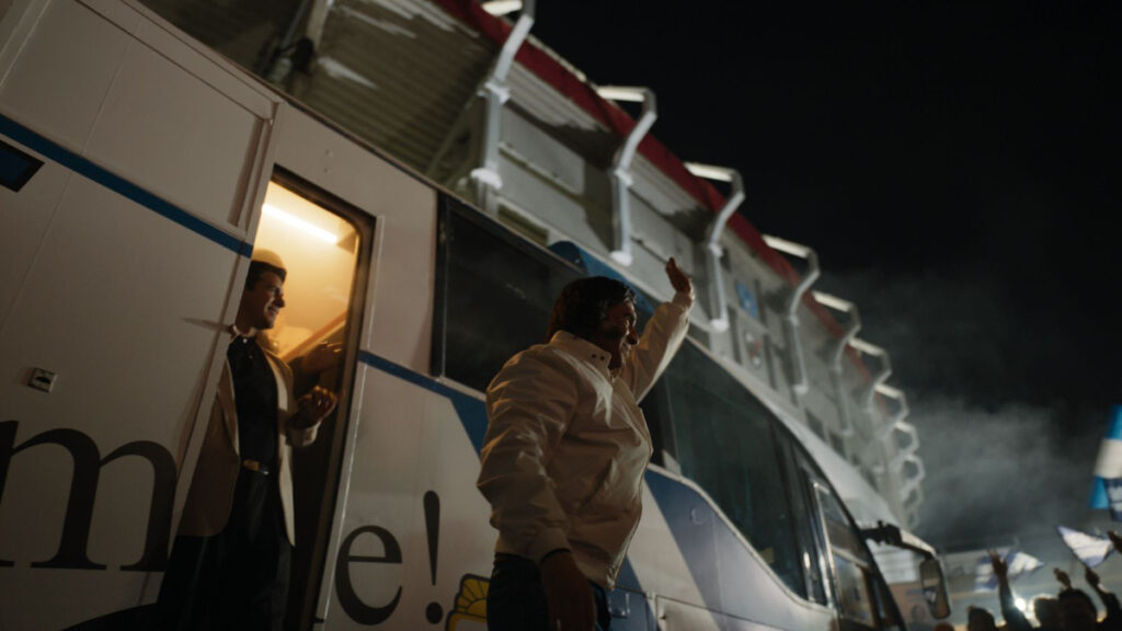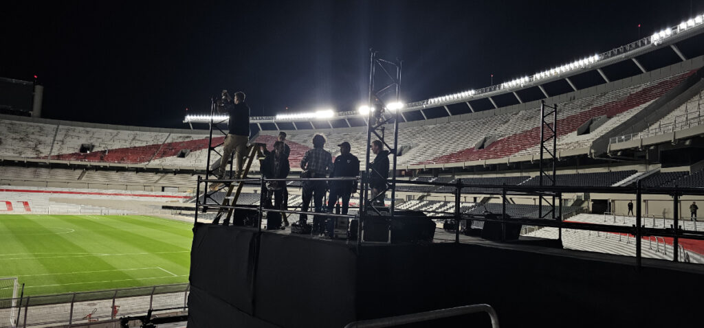 El rodaje fue simple, se armó el escenario con luces en cuadro propias de un evento de ese tipo y usamos las luces del estadio que obviamente no eran las de la época, con lo cual después en color cambiamos la temperatura color emulando el cálido de aquellas luces.