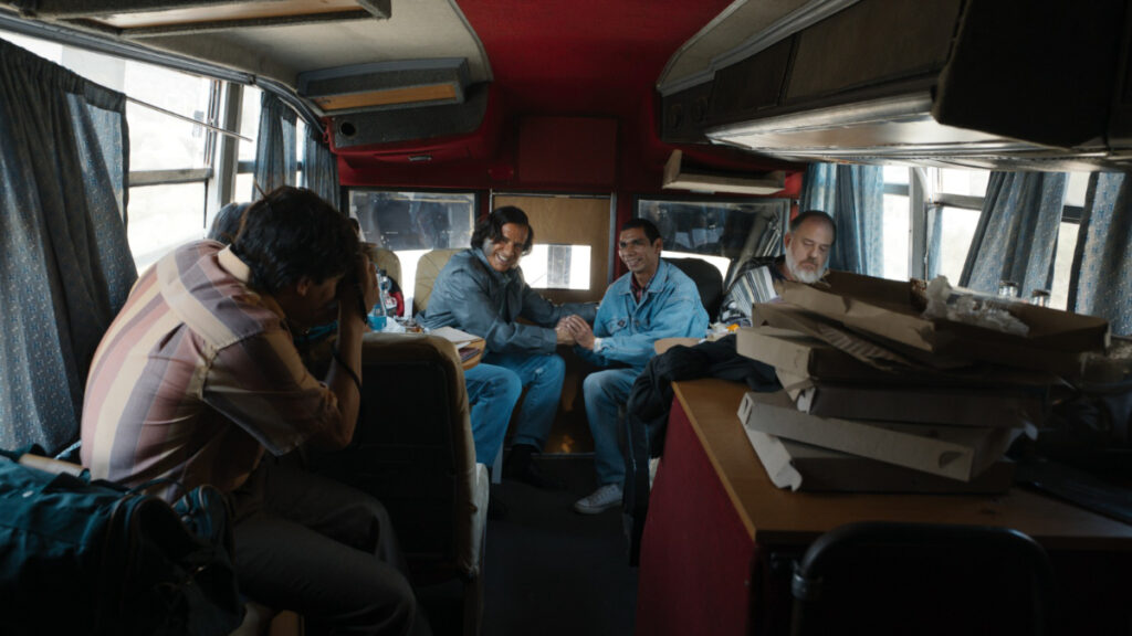 Queríamos que lo que se vea por la ventana y el movimiento sea real. Sentábamos a los personajes según nos convenía por la dirección del sol, tratando de no banderearlo demasiado y así ver lo más posible, en algunas situaciones apoyamos un poco con Asteras, pero generalmente no pusimos nada. Fueron 2 jornadas, incluyendo la estación de servicio donde Olegario decide volver a Buenos Aires y algún exterior más.